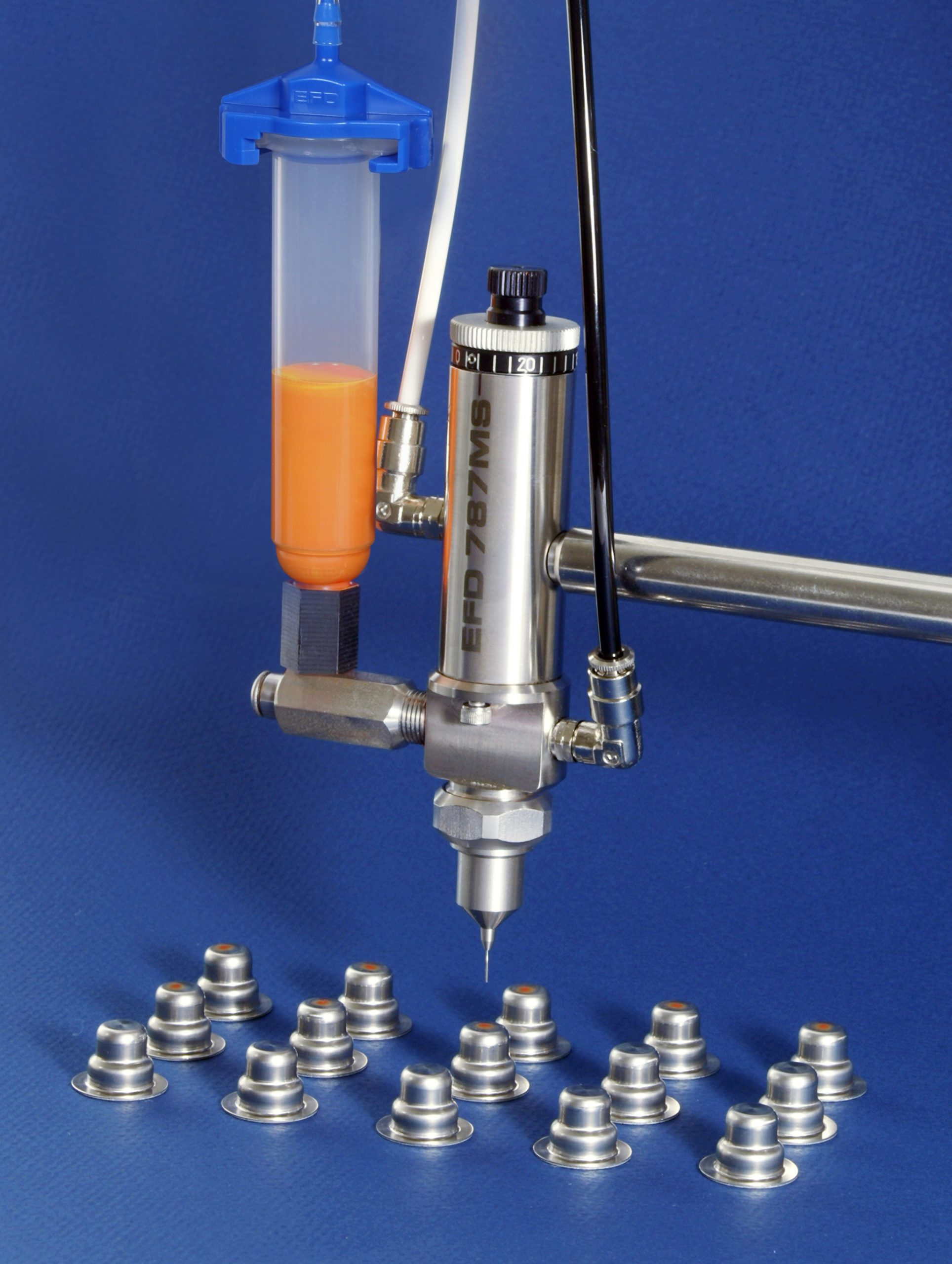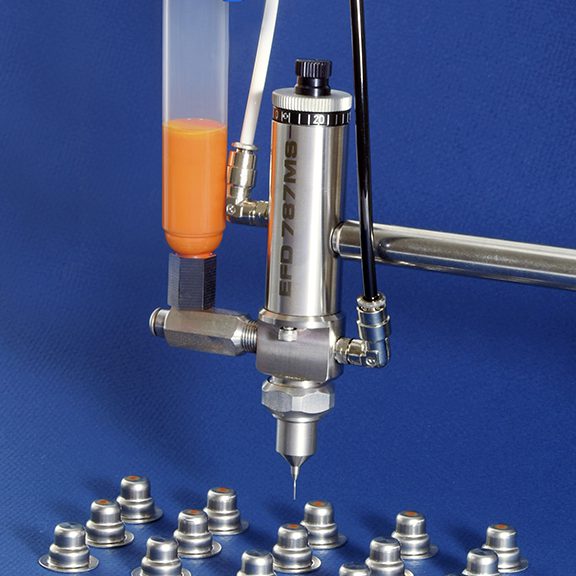 The 787MS-SS increases throughput and allows greater process control, while reducing production costs and rejects. The valve needle seats in the hub of the dispensing tip, virtually eliminating dead fluid volume between shots.
