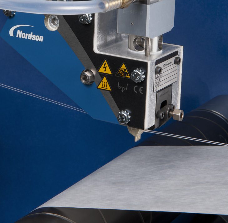 Patented Allegro nozzles use a novel air-assisted contact coating technology to apply hot melt adhesives to single or multiple elastic strands in nonwoven disposable hygiene article manufacturing. This advanced nozzle technology delivers precise adhesive deposition with exceptionally-low variability for elasticized legs, leg cuffs and waist bands on baby diapers, training paints and adult incontinence products.