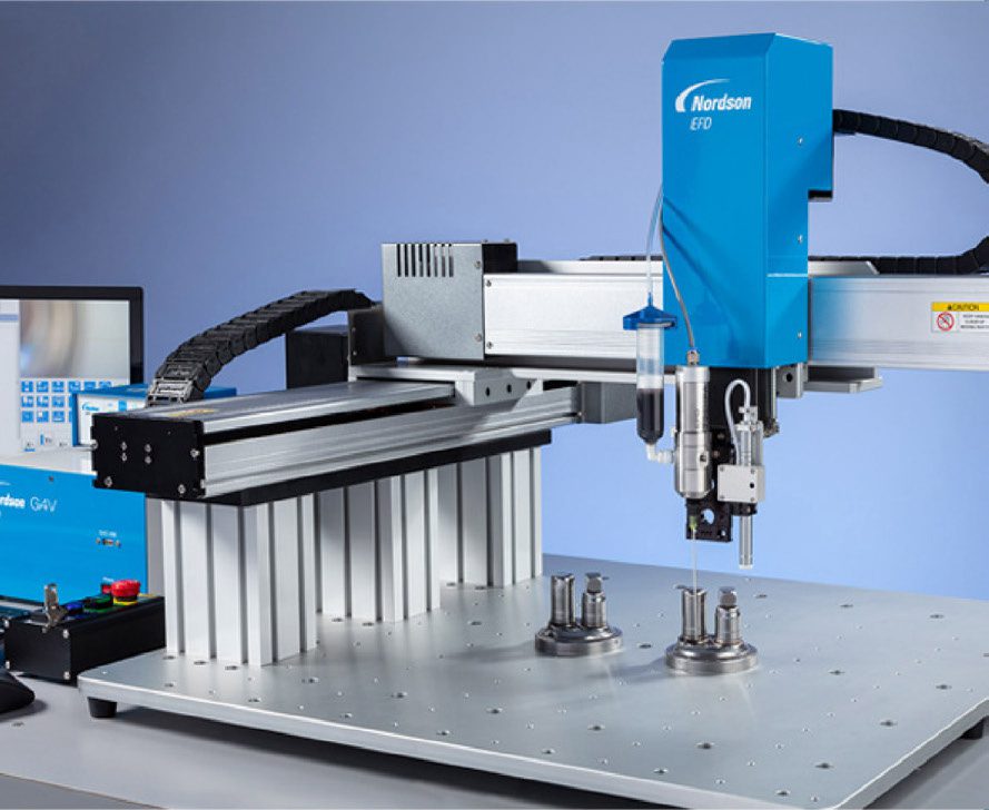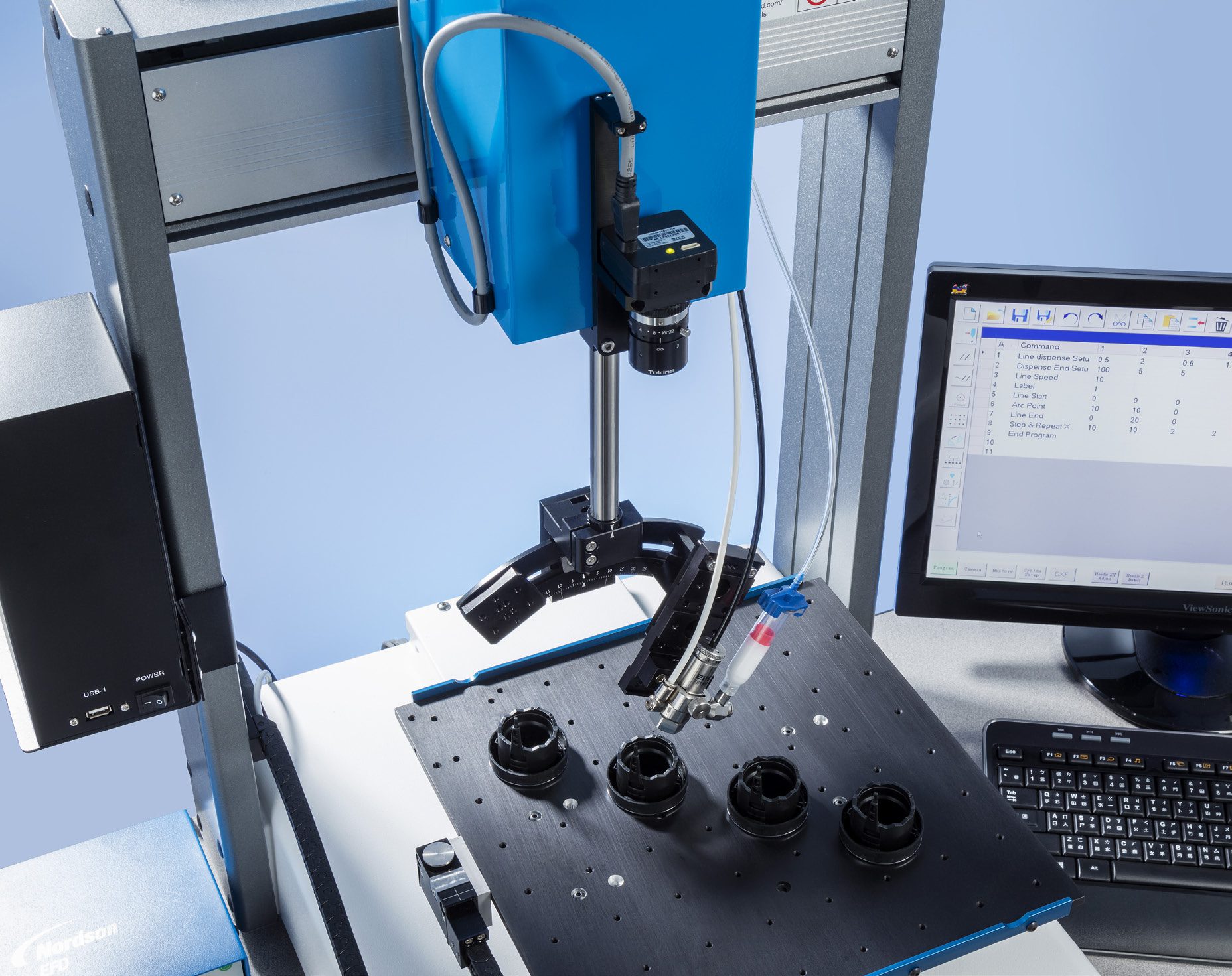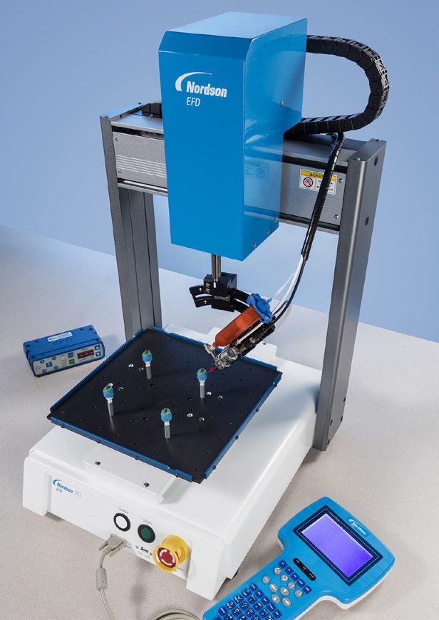 The E Series automated fluid dispensing system is a desktop robot that features a simple-to-use Teach Pendant for quick setup and easy programming.