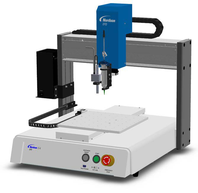 The EV Series automated fluid dispensing system is a desktop robot that delivers easy automation for precise fluid applications with proprietary dispensing software and a simple vision pencil camera.